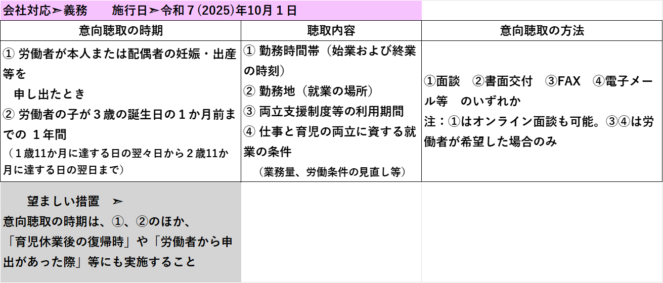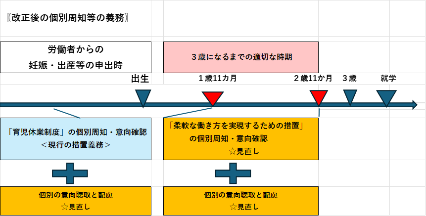 妊娠・出産の申出時や子が3歳になる前に、労働者の仕事と育児の両立に関する個別の意向聴取・配慮が事業主に義務付けられます。