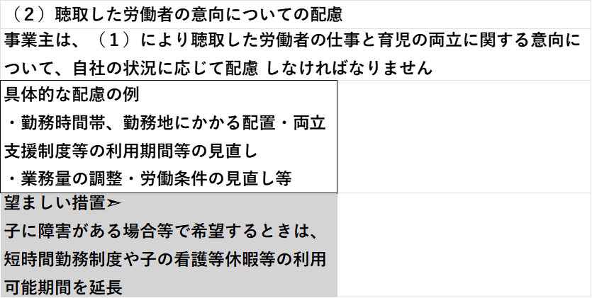 - 意向の配慮を行う際は、例えば勤務時間帯・勤務地にかかる配置、業務量の調整、両立支援制度の利用期間等の見直し、 労働条件の見直し等について、自社の状況に応じて、労働者の意向に配慮する必要があります。